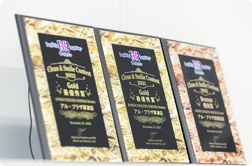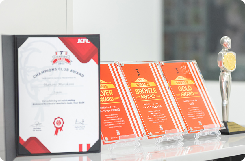 接客の質、スピード、清潔さ、店舗運営などで高い評価をいただき、KFC・サーティワンから多くの賞を受賞しています。