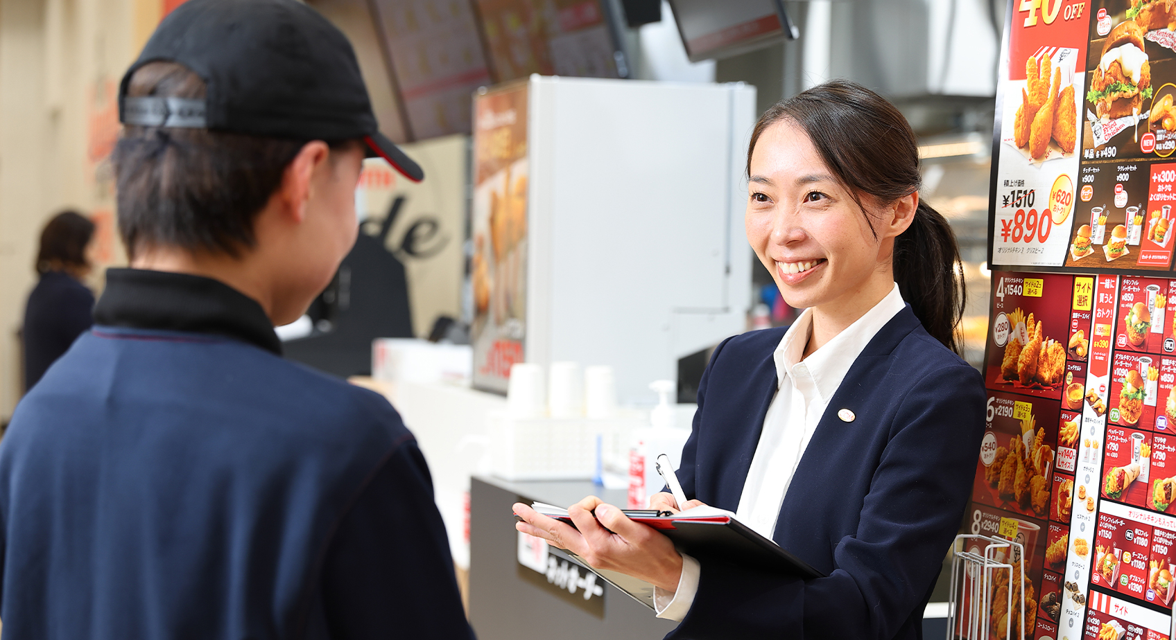 私は現在、エリアマネジャーとして京阪エリアにあるケンタッキー・フライド・チキンの8店舗を管轄しています。また、そのうちの1店舗である「アル・プラザ香里園店」の店長も兼任しています。